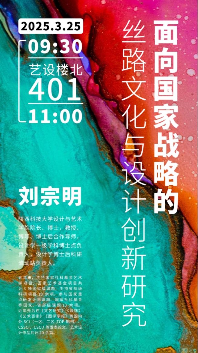 筑艺讲坛(一百七十五)《面向国家战略的丝路文化与设计创新研究》时间:9:30~11:00(2025年3月25日)地点:艺设楼北401面向人群:全校感兴趣的师生 刘宗明,男,1978年生,江西吉安人,中共党员。现任陕西科技大学设计与艺术学院院长、博士,教授、博导、博士后合作导师,设计学一级学科博士点负责人,设计学博士后科研流动站负责人。江...