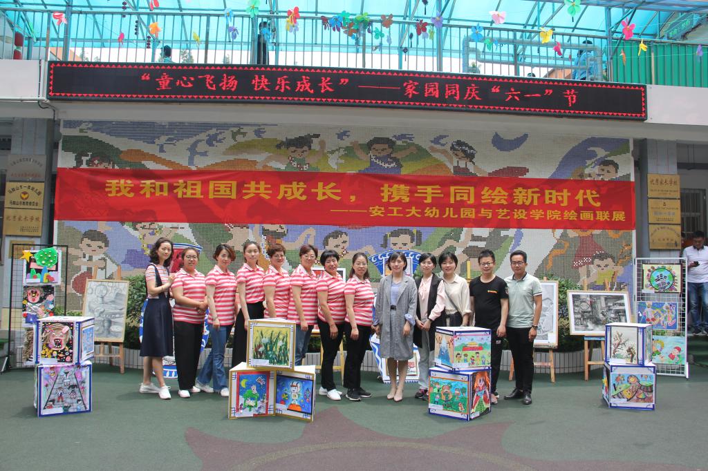 的部分师生党员共同完成的,幼儿园小朋友以“我爱祖国”和“快乐童年”为主题创作,作品展现了小朋友眼中的美好生活以及对壮丽祖国的描绘;另一部分作品是由师生党员以“建国70周年”为主题创作,展现祖国70年来的时代变迁和辉煌历程以及今天的幸福生活,同时也表达了学生对祖国衷心美好的祝福。