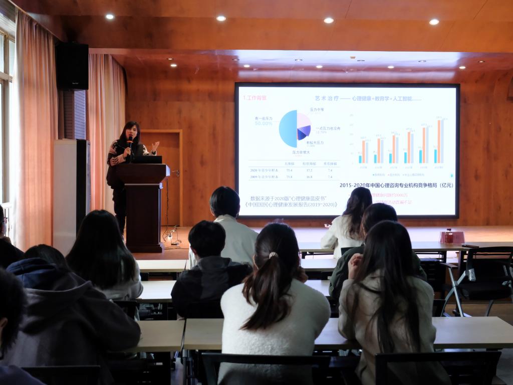 此次讲座,佘慧莉老师围绕艺术治疗融合研究的概念、艺术治疗常用手段、团队成果展示等方面进行介绍。佘慧莉老师向同学们解释,艺术治疗是一种以艺术形式在心理治疗领域中充当介质时的疗愈过程,在治疗过程中既需要介入心理学等理论方法,也需要融合各类艺术载体,是一种典型跨学科属性的融合研究。讲座中,佘老师结合生动案例和团队成果从多角度讲述艺术表达与治疗方法的交融过程,讲座末尾,佘老师邀请在场同学们完成解压艺术的测试问卷,释放心理压力,开展现场答疑,现场掌声不断。