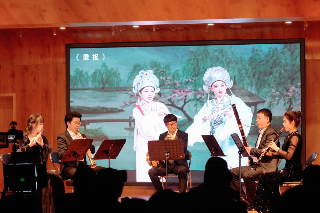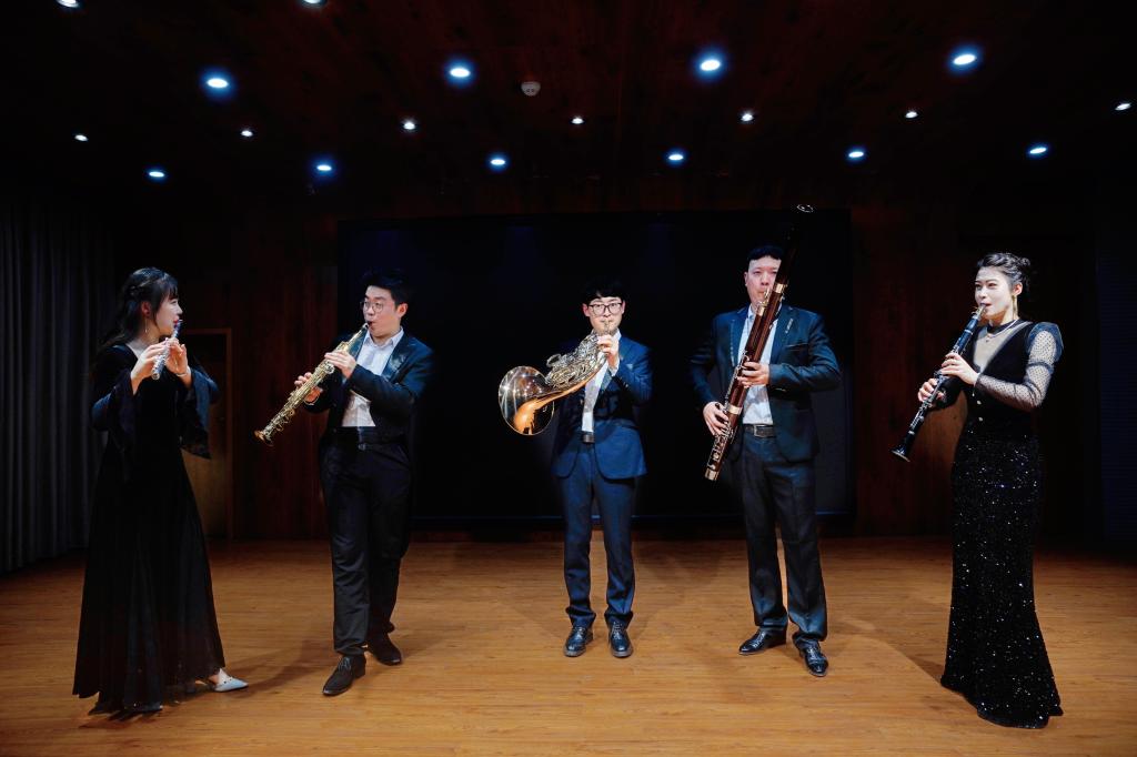入场开始,主持人向在场观众介绍木管五重奏的音乐表演特点,并由吴奕昕等五位老师现场为观众进行各个乐器的独奏展示。本次听赏会以一首《卡门组曲》正式拉开帷幕,它以其充满激情和色彩斑斓的曲调瞬间将西班牙的独特风情展现在观众面前,成功呈现了一幅充满异国情调的音乐画卷。随后《梁祝》、《第二圆舞曲》、《在那遥远的地方》、《今夜感受我的爱》、《在水一方》、《花样年华》、《多瑙河之波》等中外经典曲目交替进行,既将爱情的浪漫与悲剧罗列其中,又交织着对家乡的眷恋与对未来的期盼,一首首优美的旋律和真挚的情感,抚慰了无数听众的心灵。一首《瑶族舞曲》,奏出瑶族千年文化精髓,凝聚中华民族大团结力量;一曲《一步之遥》,展现逆境重生风采,鼓舞拼搏奋进的斗争士气。接下来,一首耳熟能详的台湾民歌《阿里山的姑娘》点燃现场欢乐气氛。本场听赏会的最后,用一首《我和我的祖国》致敬新中国,礼赞新时代。欢快的旋律飘向了音乐厅的每一个角落,现场观众无一不激动欢呼,掌声连绵不断。