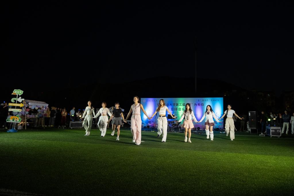 活动伊始,由校舞蹈社部分成员带来的女团舞《Yes!Ok!》用律动甜美的节奏瞬间点燃全场气氛,来往观众无一不被吸引。一舞结束,《美好的事能不能发生在我身上》、《还我蔚蓝》、《吉他与孤独与蓝色星球》、《只有音乐才是我的解药》以及《choose me》接力献唱,星空下的草坪仿佛变成了理想的花园。随后上演的舞蹈《GMIX》舞姿简约帅气,充满现代气息。夜幕渐渐昏沉,但表演的浪潮愈发热烈,模特协会的同学们踩着星光而来,《华韵》登场;说唱协会的同学们用一首首高质量原创歌曲引燃全场······观众围绕成圈,举着荧光棒高呼着,欢笑着,无论是老师还是学生,亦或是慕名而来的市民都被音乐节的狂热氛围所感染,情不自禁地摆动起来。霓虹灯投下的光影在人群间跳跃舞动,人们用丰富的律动与宇宙的频率相衬,表现出对生命、对青春的热爱。