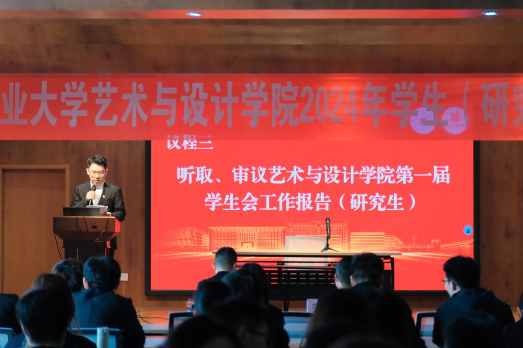 学院第一届研究生会主席孙宪智进行工作报告。他的报告全面总结了学生会过去一年的工作成果,包括组织开展的各类文体活动、志愿服务、社会实践等,同时也指出了工作中存在的不足和今后努力的方向。