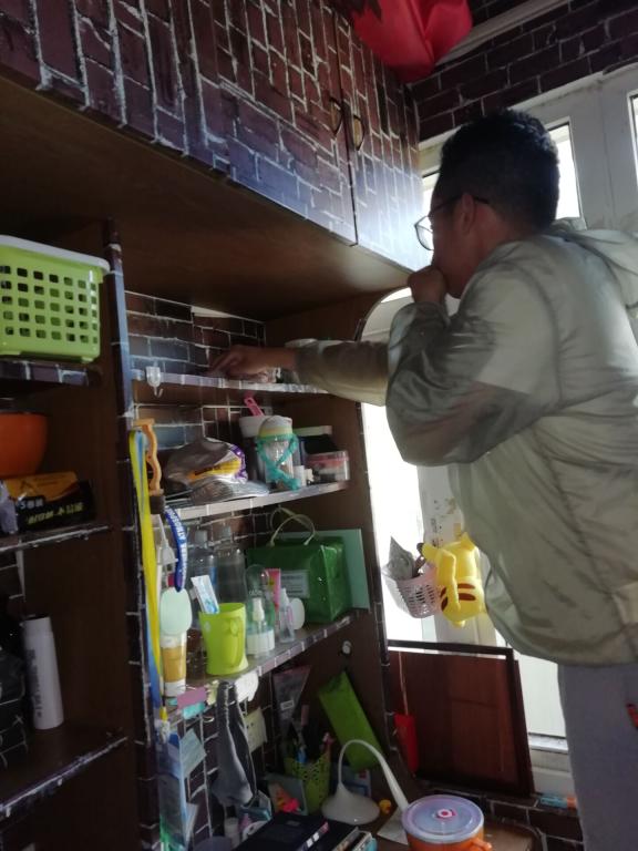 辅导员李亚飞和宿舍管理员王连华首先统一打开宿舍门和阳台的门窗进行通风,连续对宿舍通风两天,并计划开学前两天再对学生宿舍通风一天,保证宿舍空气对流三天,最大化去除屋内的湿气和霉气;其次对学生被褥逐个做检查与整理,对于出现发霉的床铺,两位老师将发霉的被褥、席子拿到广场或阳台晾晒并拍打掉被褥上的霉菌,为防止出错,还在每条被褥上贴上事先准备好的标签;同时两位老师再次清理了宿舍各个角落里已开封的食品、水果或者其他垃圾,并将部分腐烂、风干、过期的食物清理出去;最后两位老师还检查每个宿舍中潜在的安全隐患,进一步检查学生宿舍内的桌椅、水电以及墙壁等设备设施情况。
