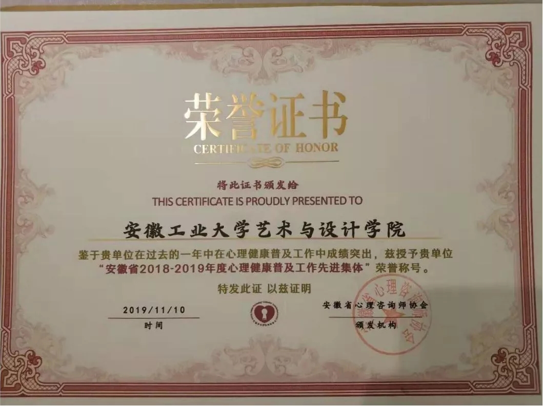 荣获安徽省2018-2019年度心理健康普及工作先进集体。