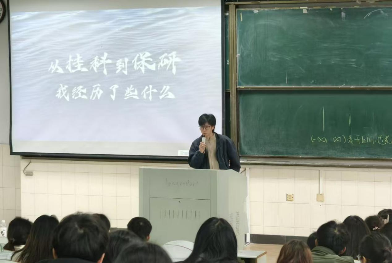 的优秀学子们依次向同学们分享保研的经验,包括如何在本科阶段平衡学业与科研、如何积极参与学术竞赛和实践活动、如何准备保研材料、如何提升面试技巧等。境212班林鑫平同学用“一个垃圾袋的故事”为主题,诠释了自己从挂科再到成功保研的逆袭故事,勉励在场学子,要敢于突破自己的限制,勇毅前行。