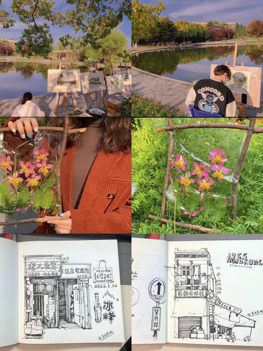 同学们及时调整自我,充分发挥艺术与设计精神,结合自身专业,将专业与生活融入。走入校园之中,在校园中寻找最美的画面,取校园中掉落的树枝和花瓣,利用绘画、手工、手绘等技法记录下美好景象,呈现出不同视角的校园。通过自我陶冶情操,泰然自若面对疫情期间封校管理带来的烦闷和不安。