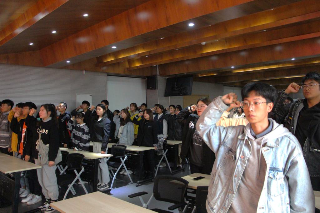 伴着激昂的团歌,“三证”颁发仪式正式开始。老生代表刘慧洋和新生代表倪王梓依次上台发言,阐述了团员的职责与义务,并呼吁同学们铭记先辈作风,勇担使命责任,严于律己、力争上游,为早日成为国家栋梁之才而努力学习。随后,倪王梓带领团员代表进行了庄严的入团宣誓。接着,汪正表达了对新生团员的期盼与要求,他希望共青团员们牢记入团誓词,切实履行团员义务,树立正确的世界观、人生观和价值观,努力成为一名优秀的共青团员。最后,各年级辅导员为新生代表佩戴团徽,颁发团章和团员证。
