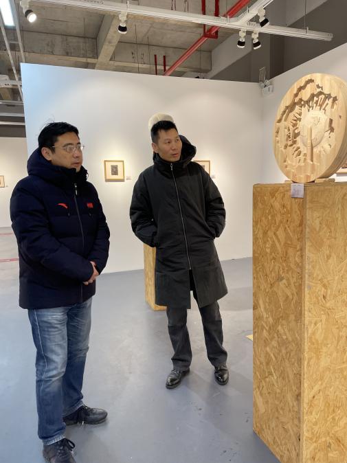 在设计艺术馆,副院长庄德红介绍了学院教学工作的改革和规范化建设情况,汇报了课程思政建设的特色做法和初步创建成果,以及教学成果展主题导入和和作品创作思路。郑啸处长肯定了学院在课程思政建设中结合艺术形式和手段,把偏重理论的思想政治教育融入到形象生动、富于美感的作品中,激发学生对美的事物爱好和追求,有利于良好道德意识、品德的培养,赞赏了学院美育教育与思想政治教育的融合,在专业教育中美育教育与思想政治教育同向同行。并对学院省级课程思政建设示范中心获批立项给予了充分的肯定,希望通过中心体制机制创新推动课程思政理论研究和实践探索,力争建成在省内外高校有较强影响力和示范引领作用的课程思政研究与实践中心。
