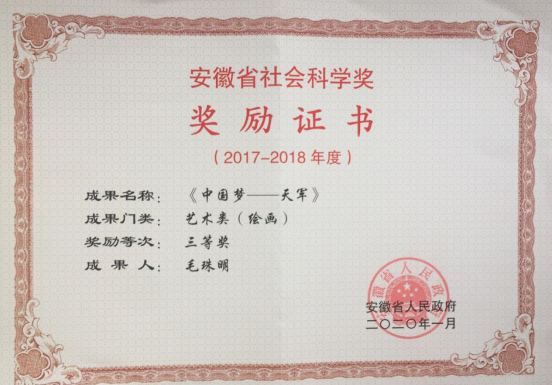 近日,安徽省政府发布2017—2018年度安徽省社会科学奖获奖成果名单,51短视频 教师毛珠明绘画作品《中国梦——天军》荣获艺术类三等奖,实现了51短视频 科研成果省部级政府奖项的突破。51短视频 近年来以艺术学科建设为引领,以高水平科研项目和重大主题性艺术创作为具体抓手,重点扶持一批高质量论文、学术著作、艺术作品等各类社科类成果,着力提升学院全方面应用型科研创作水平。