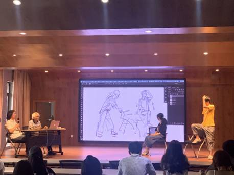 Jason首先分享了迪士尼动画经验,并对所参加项目案例进行解析,继而Jason分享了自创的等分法人体绘画技巧,并现场邀请同学当模特,进行理论运用到实践的现场绘画技巧展示;最后还针对同学们的提问进行了详细的解说和总结。他提出要从自然中学会总结,从简单的几何体入手去了解人体,把握人体的透视与动态夸张。现场学生兴趣浓厚,踊跃交流互动。
