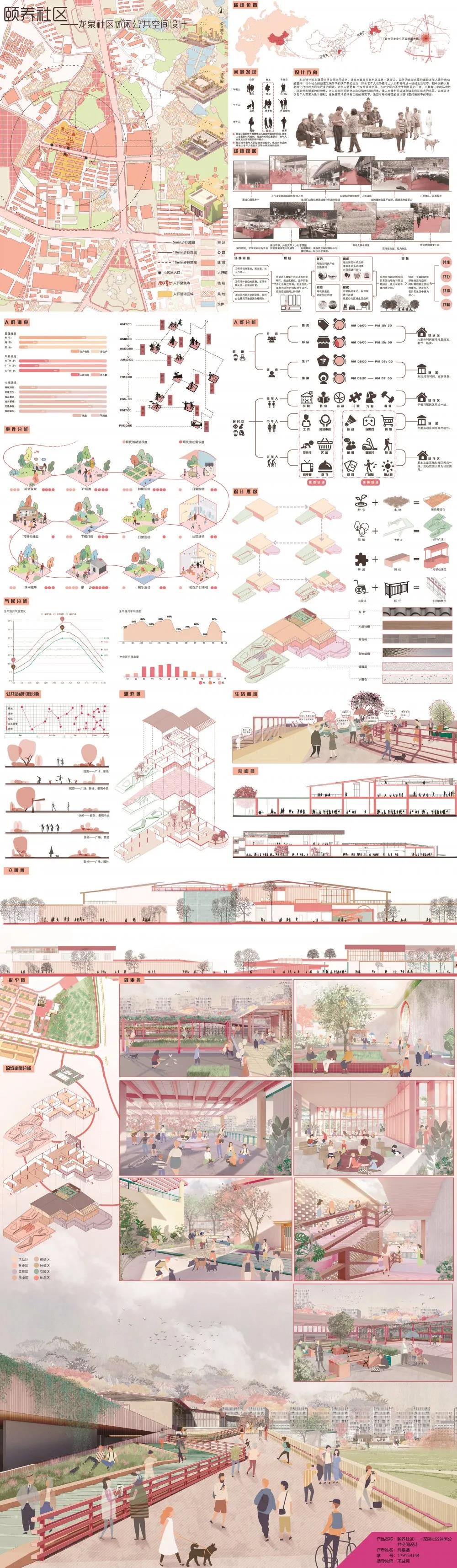 设计说明:本作品构设了功能区域分明、多样行径配以无障碍系统的老年活动休闲公共空间。秉承共生、共存、共享、共情的理念,在保留菜场贩卖功能的基础上提供自然舒适又利于满足老年群体精神需求、增进老年社区人际关系的场地。