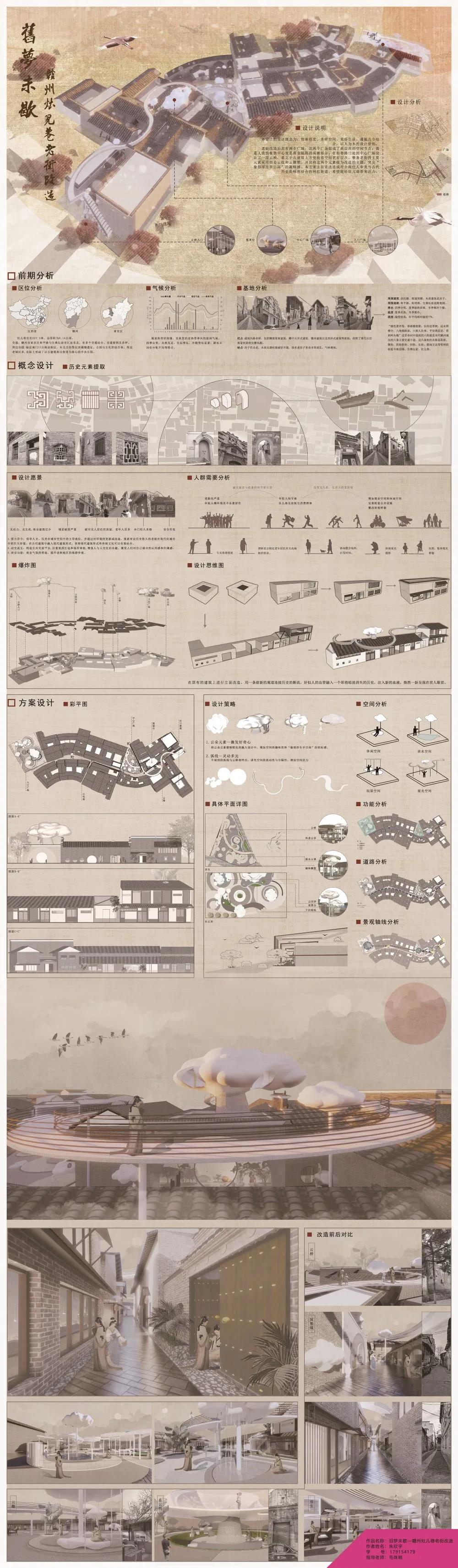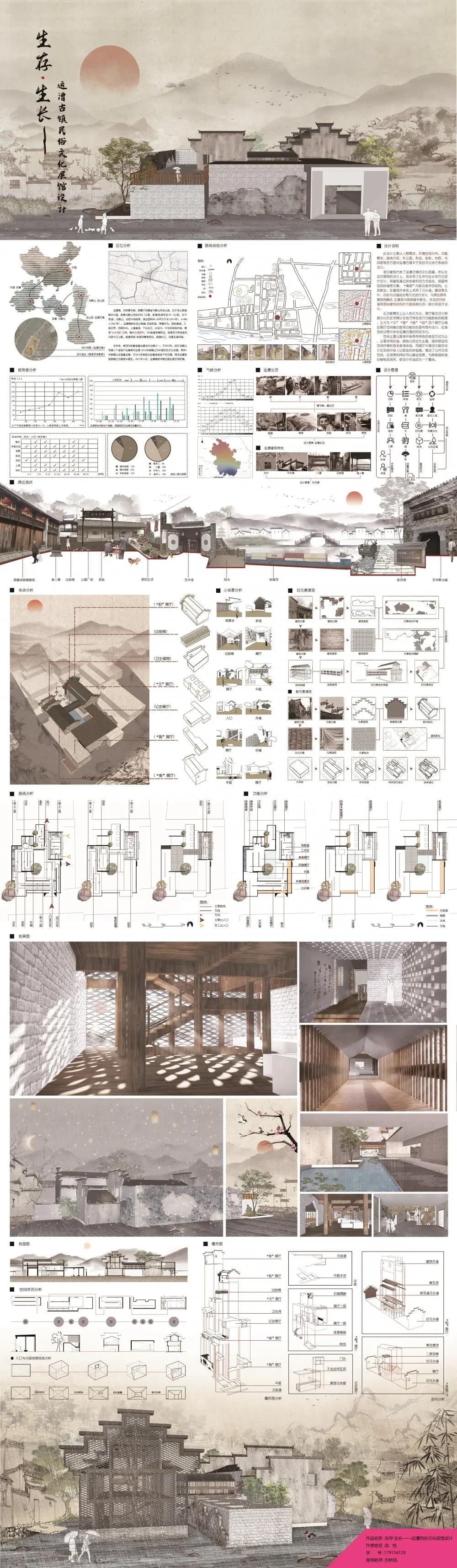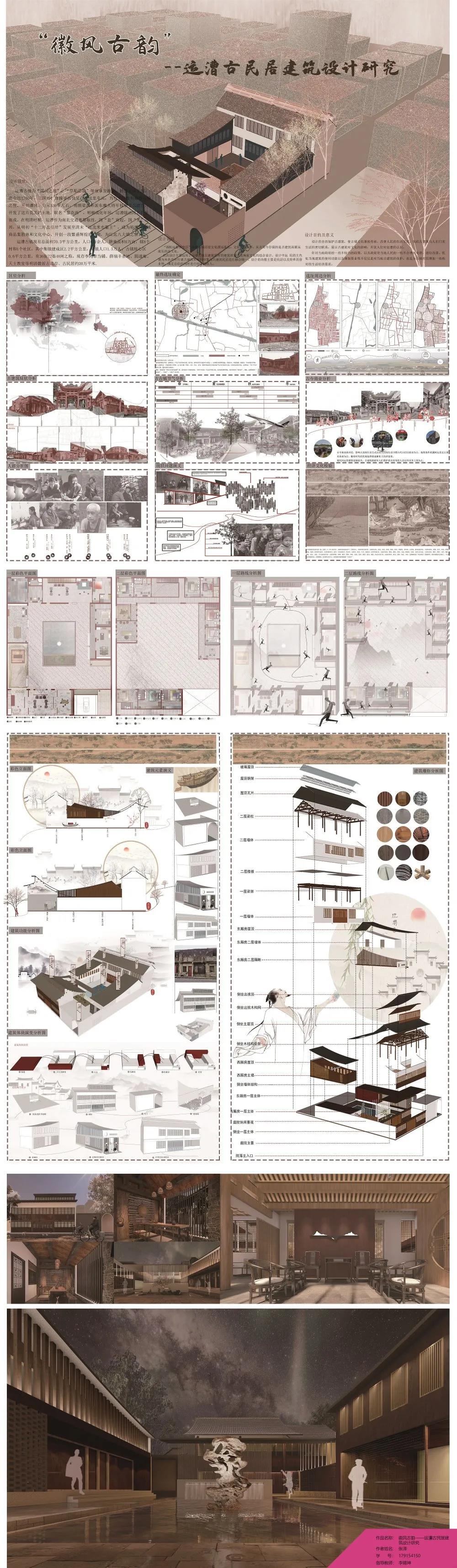 设计说明:“孤帆远影碧空尽”运漕古镇历史文化源远流长,文化底蕴深厚,从古至今存留的是古建筑而源远流长的是文化。此次设计主要运用 了运漕古镇古建筑原有的建筑样貌、四合院的空间布局以及渔家文化的综合设计,设计中运用的主色调为木色没有打破古建筑原有的印象与古建筑民居进行融合统一。设计的功能主要是民居以及简单的营业性,满足自给的同时进行经济的收入的弥补。