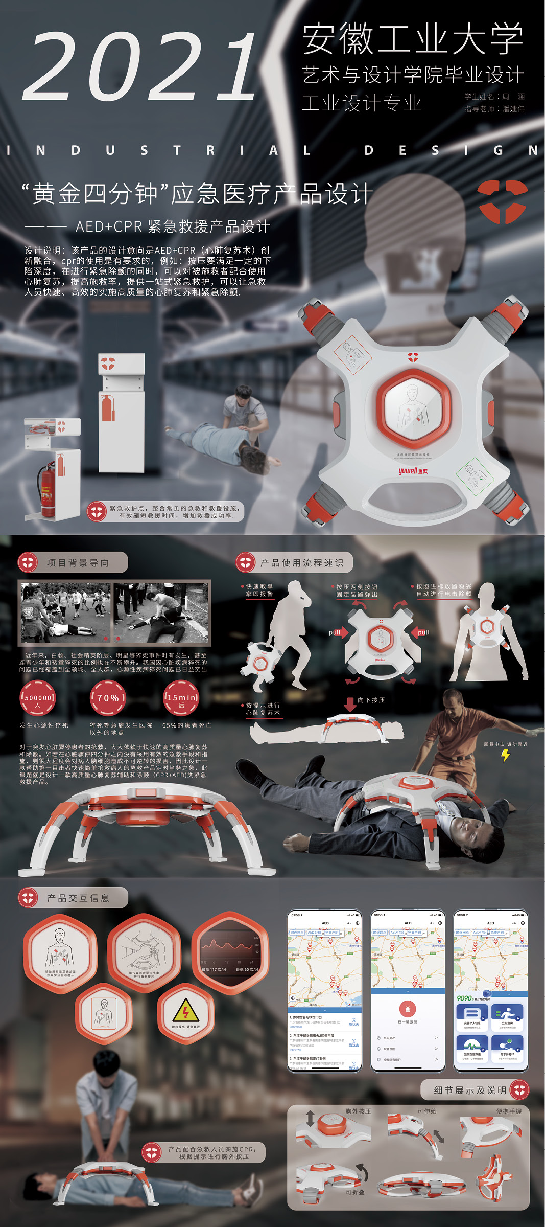 设计说明:该产品的设计意向是AED+CPR (心肺复苏术)创新融合,CPR的使用是有要求的,例如:按压要满足一定的下陷深度,在进行紧急除颤的同时,可以对被施救者配合使用心肺复苏,提高施救率,提供一站式紧急救护,可以让急救人员快速、高效的实施高质量的心肺复苏和紧急除颤.