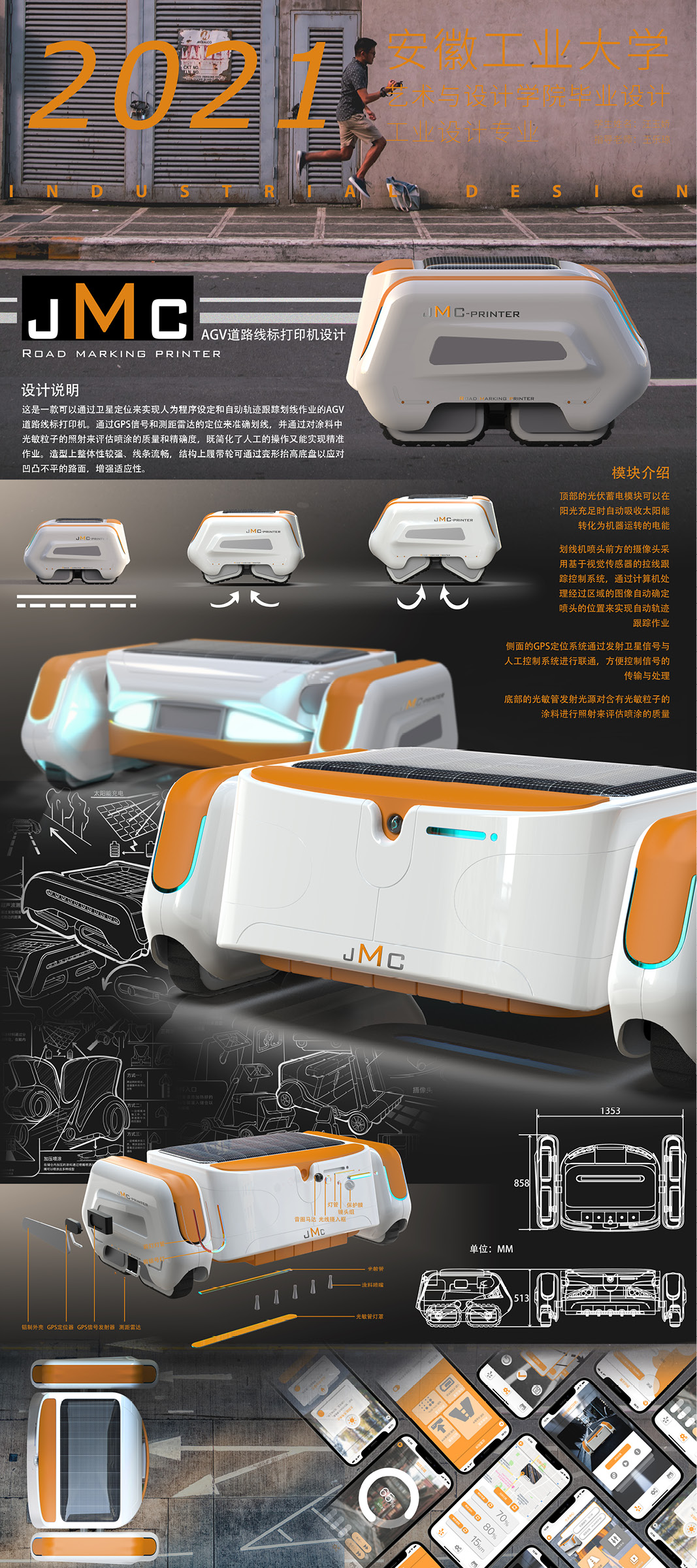 设计说明:这是一款可以通过卫星定位来实现人为程序设定和自动轨迹跟踪划线作业的AGV道路线标打印机。通过GPS信号和测距雷达的定位来准确划线,并通过对涂料中光敏粒子的照射来评估喷涂的质量和精确度,既简化了人工的操作又能实现精准作业。造型上整体性较强、线条流畅,结构上履带轮可通过变形抬高底盘以应对凹凸不平的路面,增强适应性。