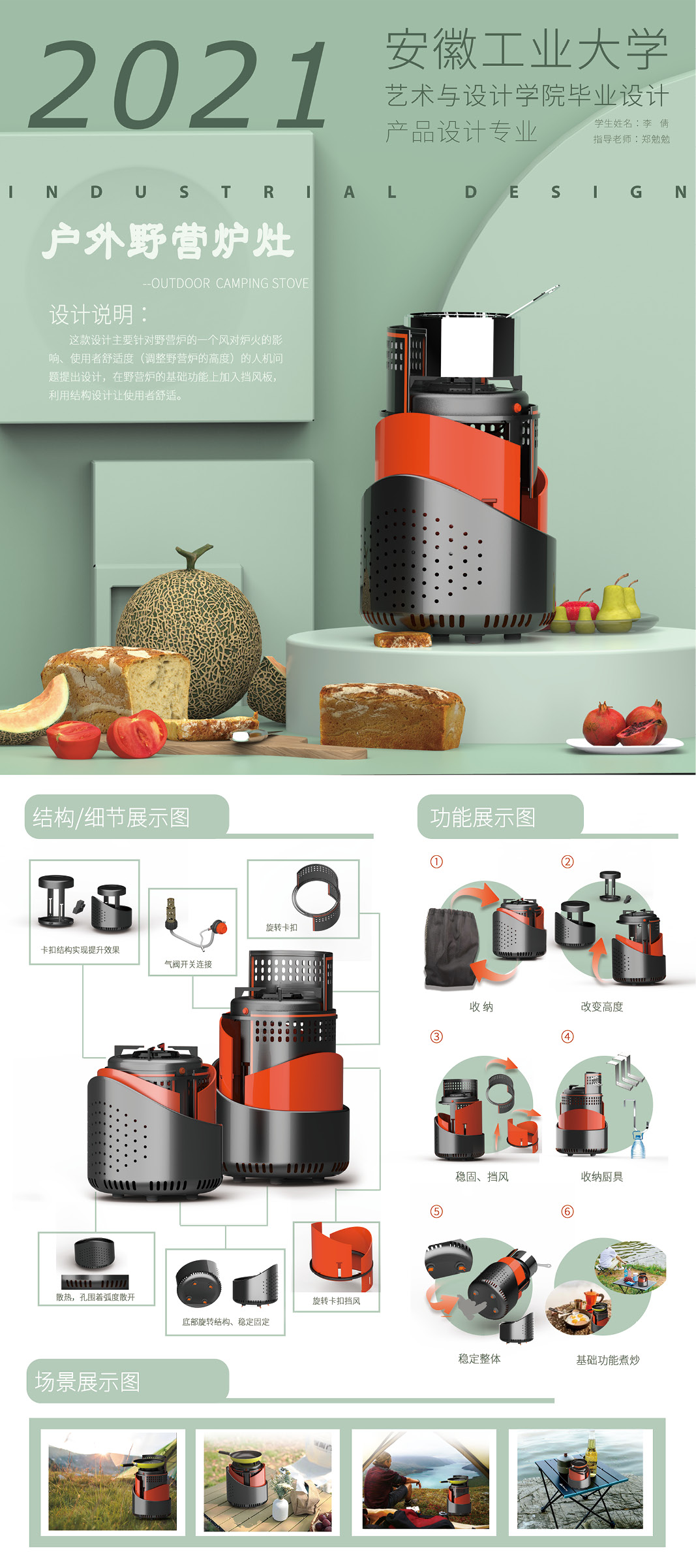 设计说明:这款设计主要针对野营炉的一个风对炉火的影响、使用者舒适度(调整野营炉的高度)的人机问题提出设计,在野营炉的基础功能上加入挡风板,利用结构设计让使用者舒适。