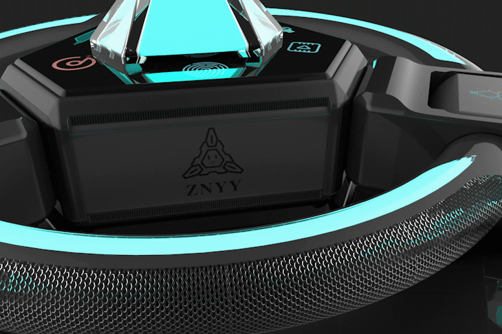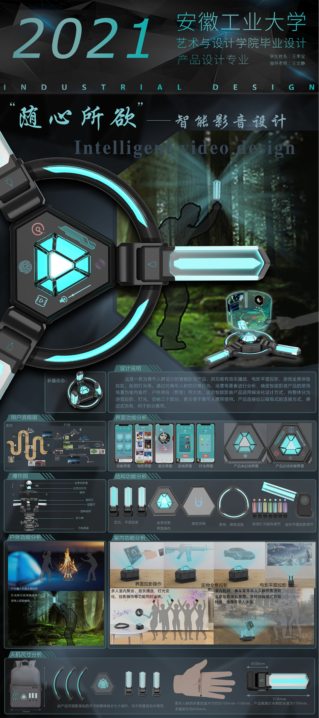 设计说明:这是一款为青年人群设计的智能影音产品,其功能有音乐播放、电影平面投影、游戏全息体验投影、氛围灯光等。通过对青年人群的日常行为、场景等要素进行分析,确定智能影音产品的使用场景为室内客厅、户外游玩(野营)两大类。这款智能影音产品运用模块化设计方式,将整体分为游戏投影、灯光、音响三个部分,更方便于青年人携带使用。产品连接处以磁吸式的连接方式,感应式充电,利于拆分携带。