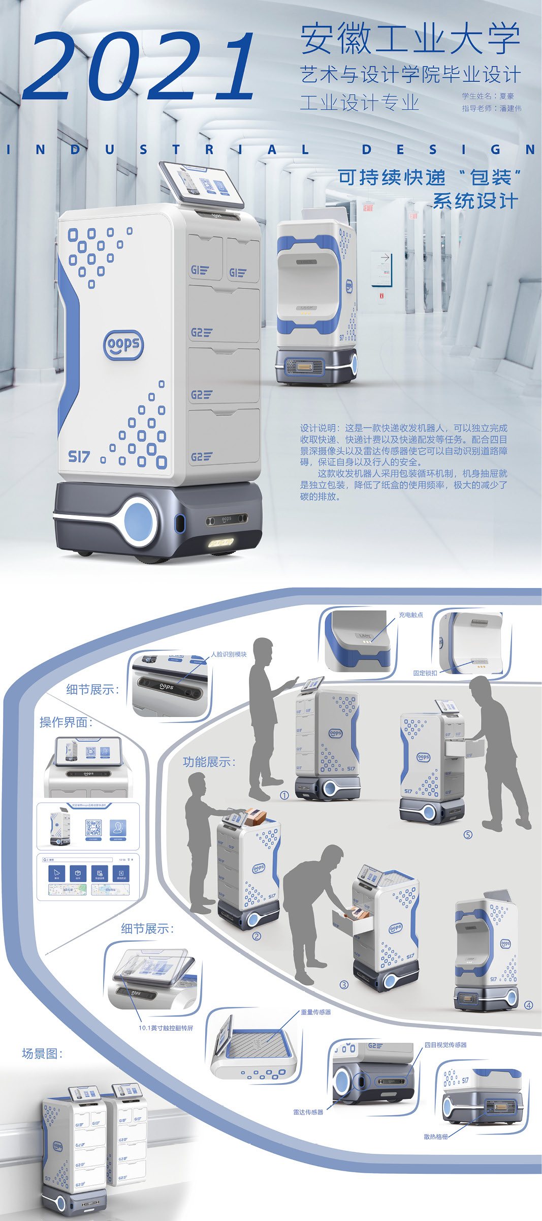 这是一款快递收发机器人,可以独立完成收取快递、快递计费以及快递配发等任务。配合四目景深摄像头以及雷达传感器使它可以自动识别道路障碍,保证自身以及行人的安全。这款收发机器人采用包装循环机制,机身抽屉就是独立包装,降低了纸盒的使用频率,极大的减少了碳的排放。