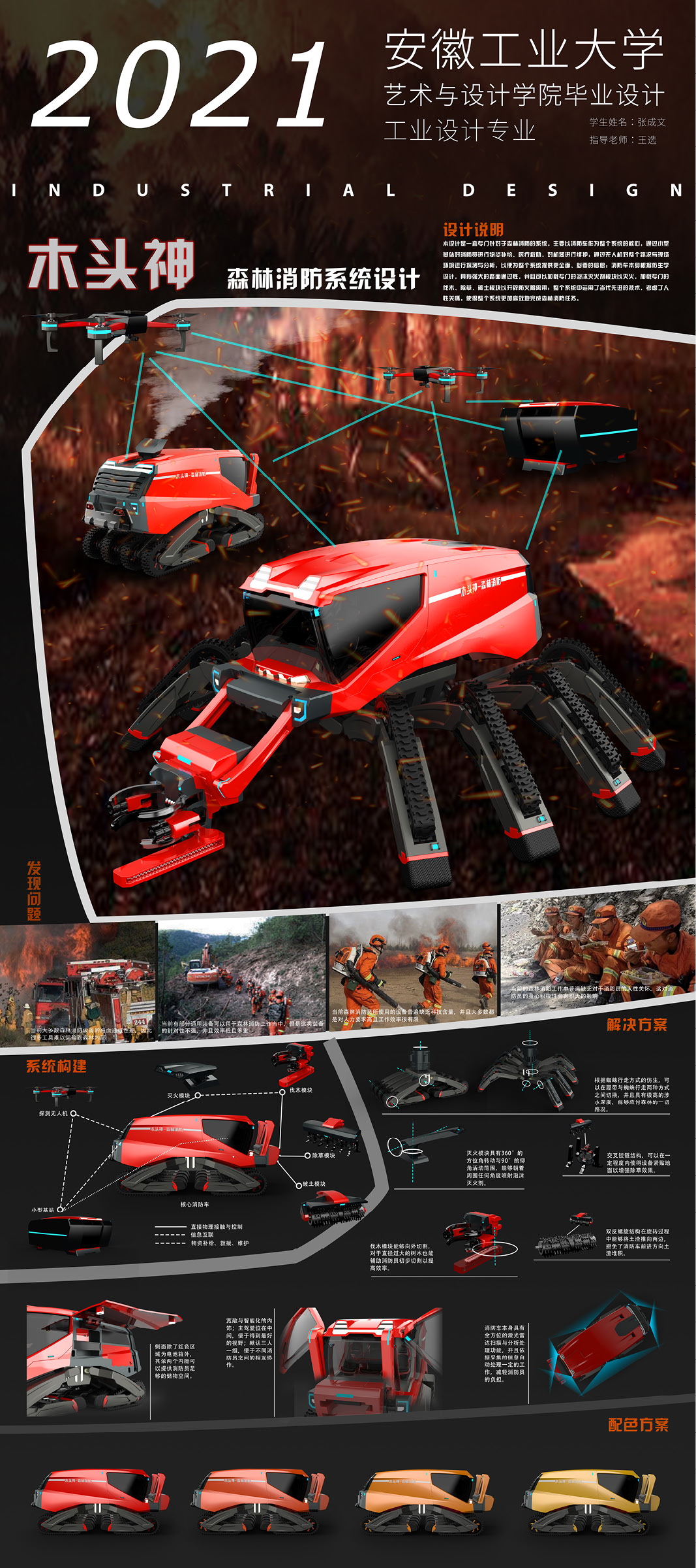 设计说明:本设计是一套专门针对于森林消防的系统。主要以消防车作为整个系统的核心,通过小型基站对消防员进行物资补给、医疗救助,对机器进行维护:通过无人机对整个路况与现场环境进行探测与分析,以便为整个系统提供更全面、必要的信息;消防车本身根据仿生学设计,具有强大的路面通过性,并且可以加载专门的泡沫灭火剂模块以灭火,加载专门的伐木、除草、破土模块以开辟防火隔离带;整个系统中运用了当代先进的技术,考虑了人性关怀,使得整个系统更加高效地完成森林消防任务。