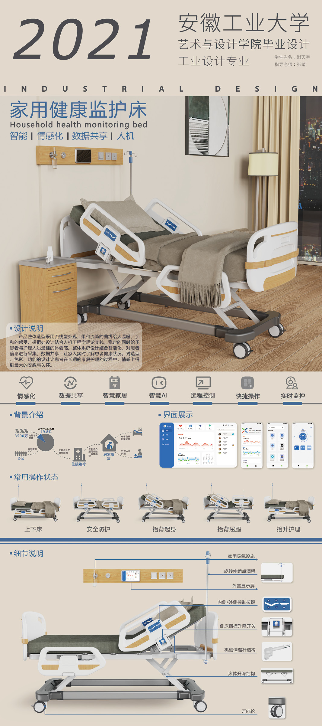 设计说明:产品整体造型采用流线型外观,柔和流畅的曲线给人温暖、亲和的感受。握把处设计结合人机工程学理论实践,稳定的同时给予患者与护理人员最佳的体验感。整体系统设计结合智能化,对患者信息进行采集,数据共享,让家人实时了解患者健康状况。对造型、色彩、功能的设计让患者在长期的康复护理的过程中,情感上得到最大的安慰与关怀。