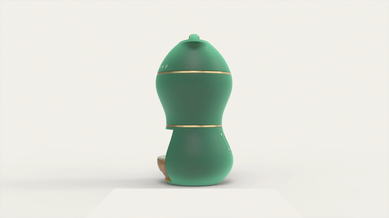 设计说明:产品主要设计来源是花生,花生又名长生果,因此取花生长寿健康、永葆青春的寓意,对花生造型进行提取,对其进行产品变形。产品主要分为三层,上层水箱,中层加药区与研磨区,下层为煎煮锅体与取药区,产品具有清洁功能,能够对煎煮过的锅体进行简单的清洗,可以在使用者不想清洁时进行简单的浸泡清洗,在浸泡后将污水排入污水盒中。