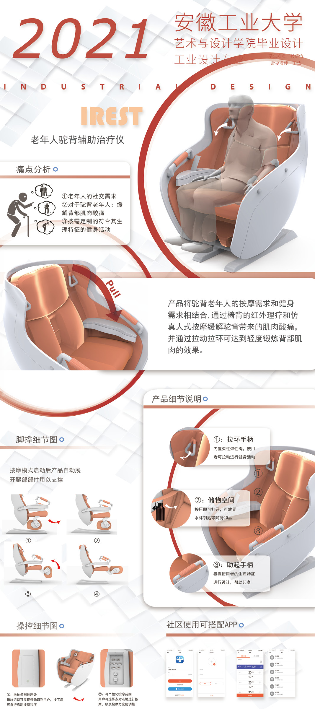 设计说明:产品将驼背老年人的按摩需求和健身需求相结合,通过椅背的红外理疗和仿真人士按摩缓解驼背带来的肌肉酸痛,并通过拉动拉环可达到轻度锻炼背部肌肉的效果。