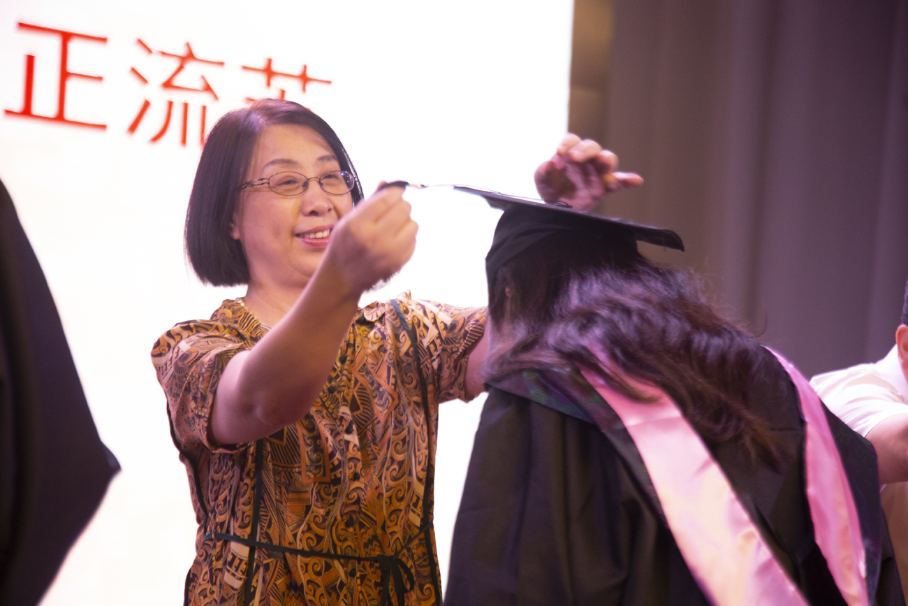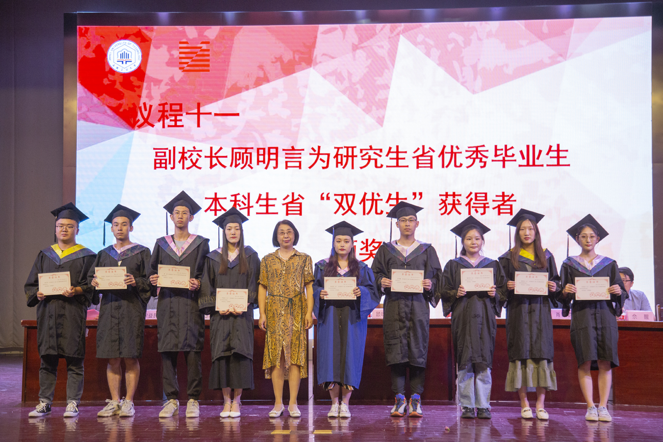 在欢快的音乐声中,领导们依次为本科生校优秀毕业生、“第二课堂成绩单”获得者代表、校友联络员代表颁发证书。副校长顾明言为研究生省优秀毕业生、本科生省“双优生”获得者颁奖,全场响起阵阵热烈掌声。